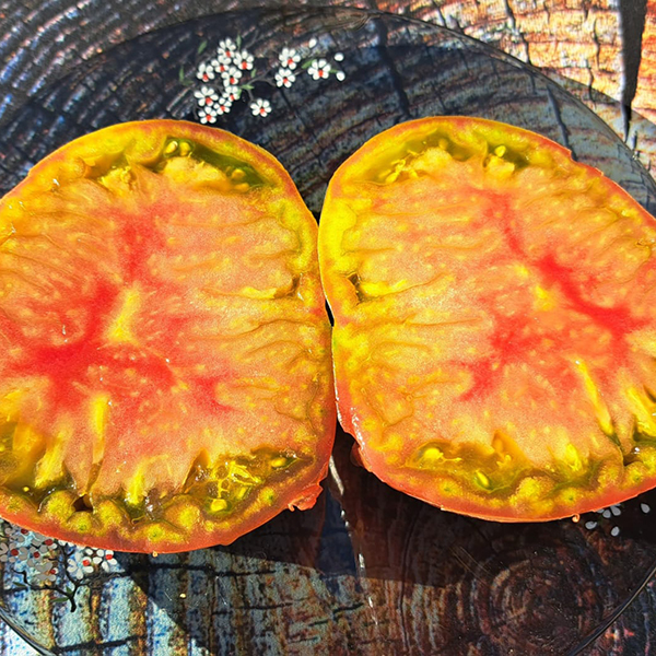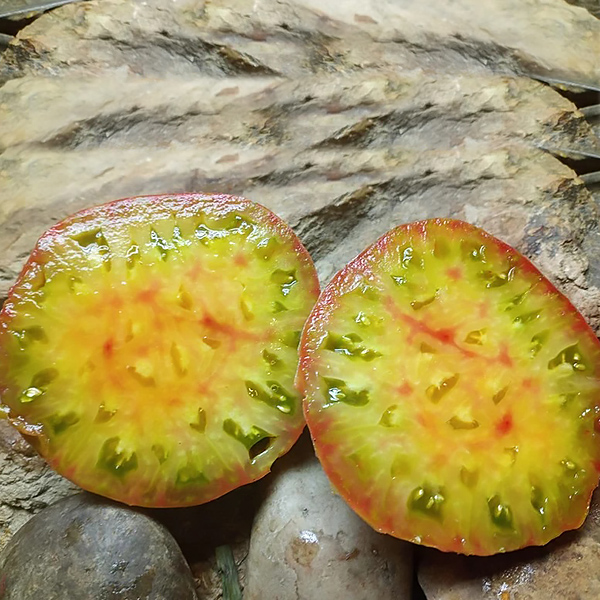 Вкус Медной реки – еще одна особенность этого сорта. Мякоть, которая, впрочем, тоже разноцветная (на зеленом фоне розовые, светло-желтые, даже красные вкрапления), не только сладковатая, с фруктовым привкусом, но еще и очень нежная, маслянистая, буквально тает во рту. В нарезке помидор смотрится прекрасно, сможет украсить собой любое праздничное застолье. В основном предназначается для салатов и соков.